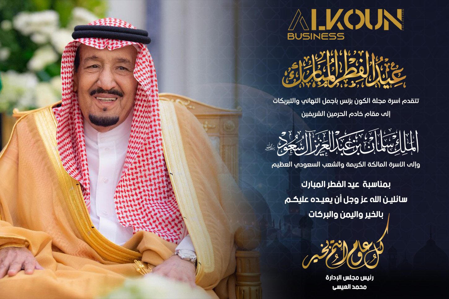 إلى مقام خادم الحرمين الشريفين الملك سلمان بن عبد العزيز آل سعود - حفظه الله ورعاه يطيب لنا في أسرة مجلة "الكون بزنس" أن نرفع أسمى آيات التهاني والتبريكات إلى مقامكم الكريم بمناسبة حلول عيد الفطر المبارك. سائلين الله تعالى أن يعيد هذه المناسب...