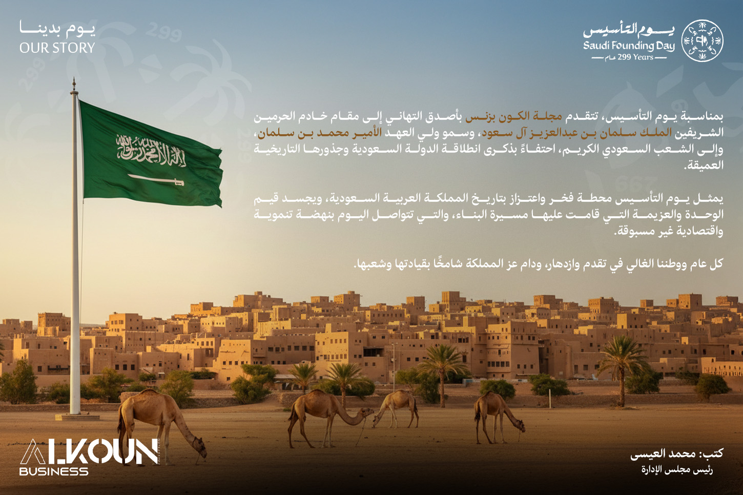 بمناسبة يوم التأسيس، تتقدم مجلة الكون بزنس بأصدق التهاني إلى مقام خادم الحرمين الشريفين الملك سلمان بن عبدالعزيز آل سعود، وسمو ولي العهد الأمير محمد بن سلمان، وإلى الشعب السعودي الكريم، احتفاءً بذكرى انطلاقة الدولة السعودية وجذورها التاريخية العميقة.